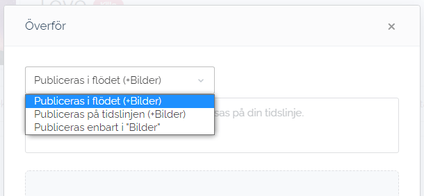 Innebär att bilduppladdningen postas som ett inlägg på er tidslinje som också är synlig i det globala flödet på sajten. Bilderna kommer även att lägga sig under “Bilder” på er profil. Detta är standardvalet. - Publiceras på tidslinjen (+Bilder)