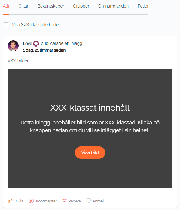 XXX-klass-filtret fungerar så att vi i det globala flödet som standard kommer att dölja bilder som är XXX-klassade. Vi kommer dock fortfarande visa inlägget, men bilderna är dolda. Man kommer dock att kunna välja att visa den dolda bilden (eller bilderna) genom att klicka på knappen “Visa innehåll”. Vill man alltid kunna se XXX-klassade bilder utan behöva bekräfta det på varje bild så kommer man att kunna välja det också i början på flödet genom kryssrutan “Visa XXX-klassade bilder”. Det valet kommer dock enbart gälla innevarande session (aktuell inloggning). Se exempel på hur det kan se ut nedan.