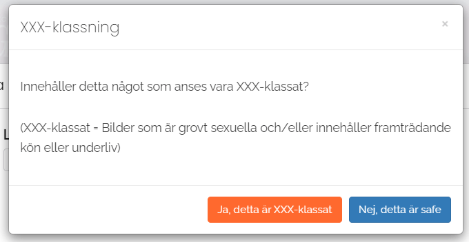Därutöver så gäller att om man laddar upp bilder som är grovt sexuella (dickpics eller hårdporr) så skall man deklarera detta genom att kryssa för att det man laddar upp är “XXX-klassat”. Detta innebär att vi kommer att kunna dölja XXX-klassade bilder för de som önskar slippa se den typen av bilder. När man publicerar bilder på Hemligg så kommer man alltid att få upp en popupfråga som frågar om bildpubliceringen ska XXX-klassas.